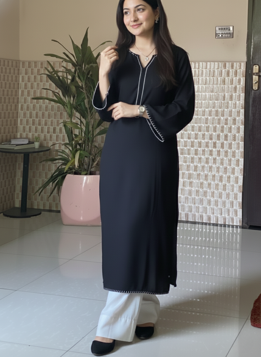 "Samita" - Black Rayon Kurta Set with Contrast White Piping