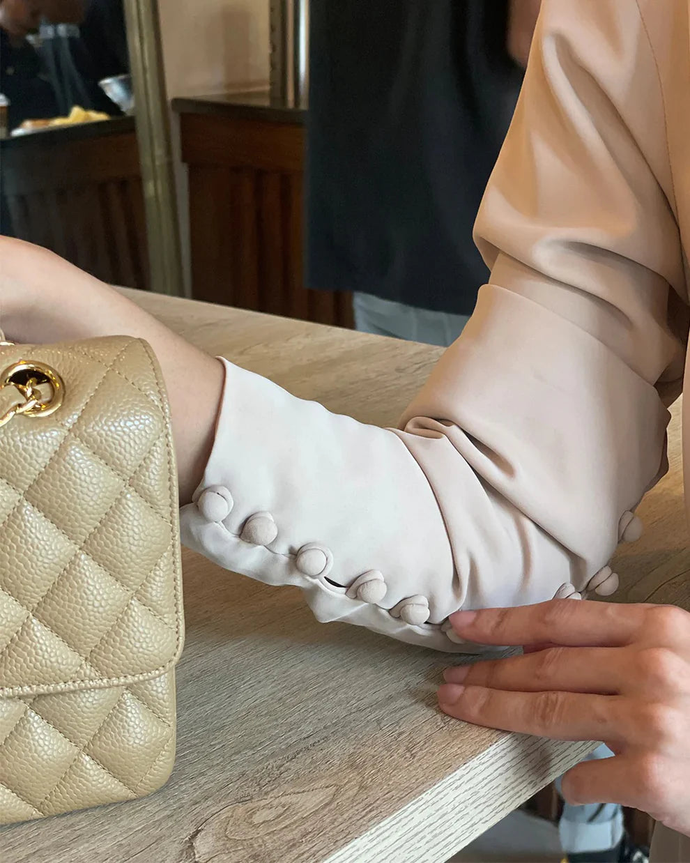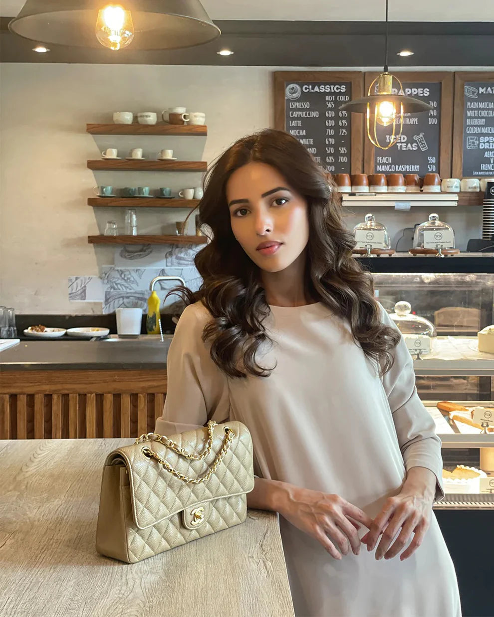 - Footwear: Elegant nude/tan sandals, pumps, or sophisticated loafers.