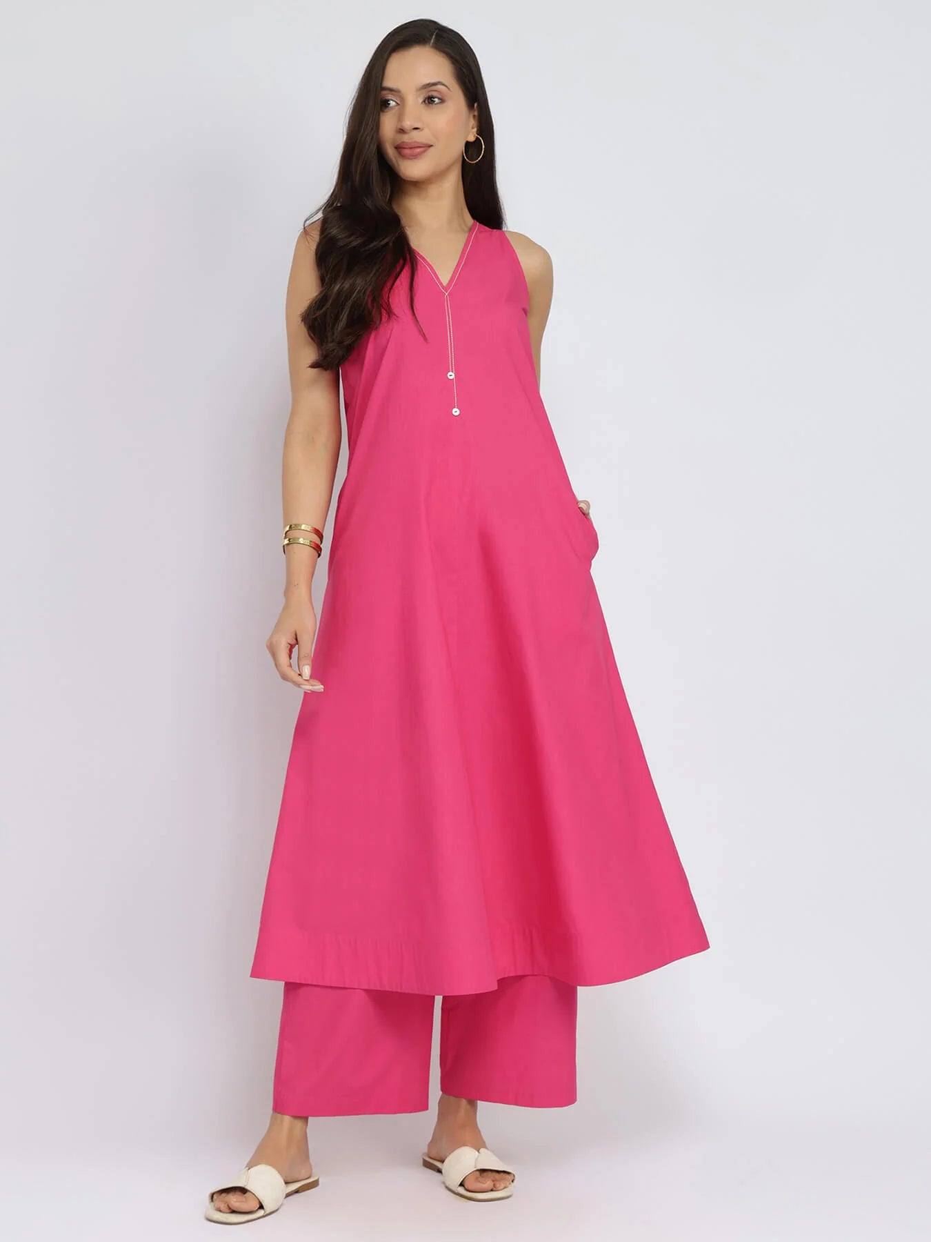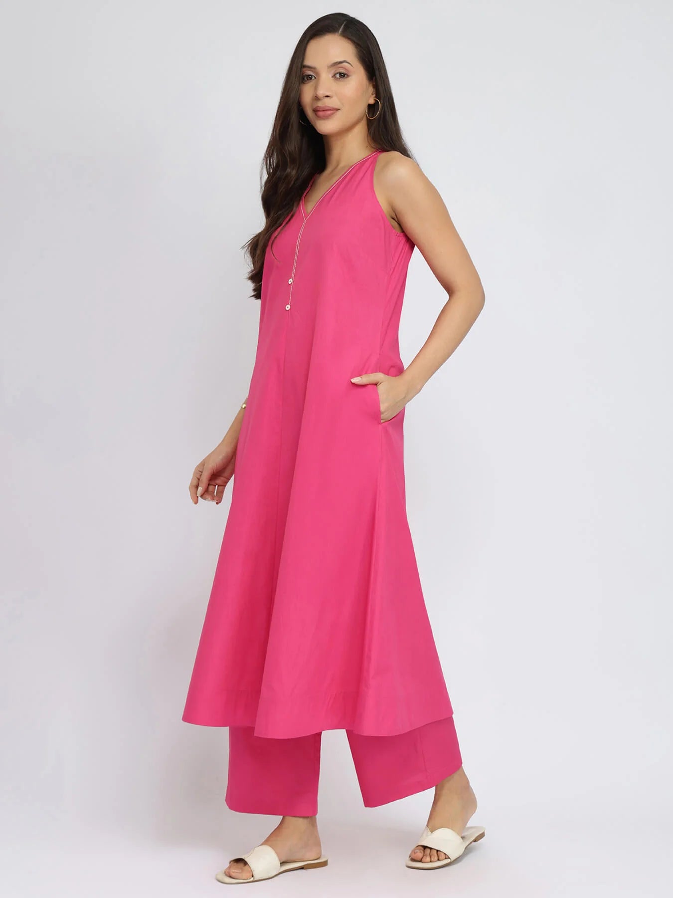 Air Loom Cotton Poplin Solid Kurta Set - Pink