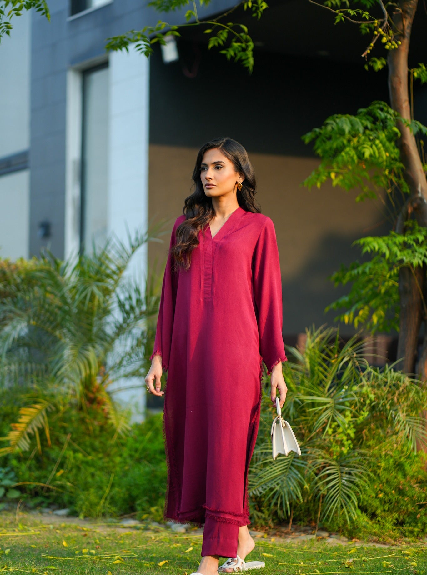 The kurta features a clean V-split neckline for a modern touch and is paired with matching straight pants that mirror the fringe detail at the ankle, creating a cohesive and polished look.