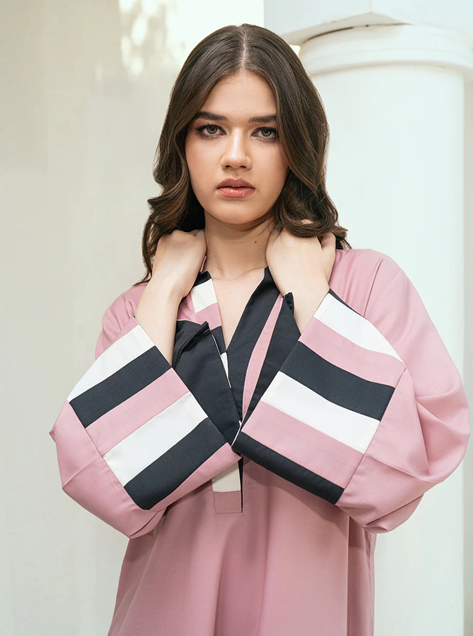 The set features contrasting black and white stripes that add a contemporary edge to the pastel base, striking the perfect balance between classic grace and modern flair. Tailored for versatility, this co-ord set transitions seamlessly from workwear to weekend outings—a timeless staple with a chic twist.