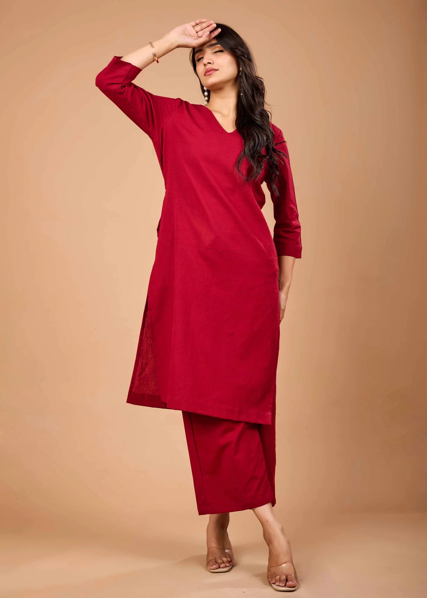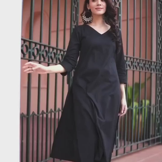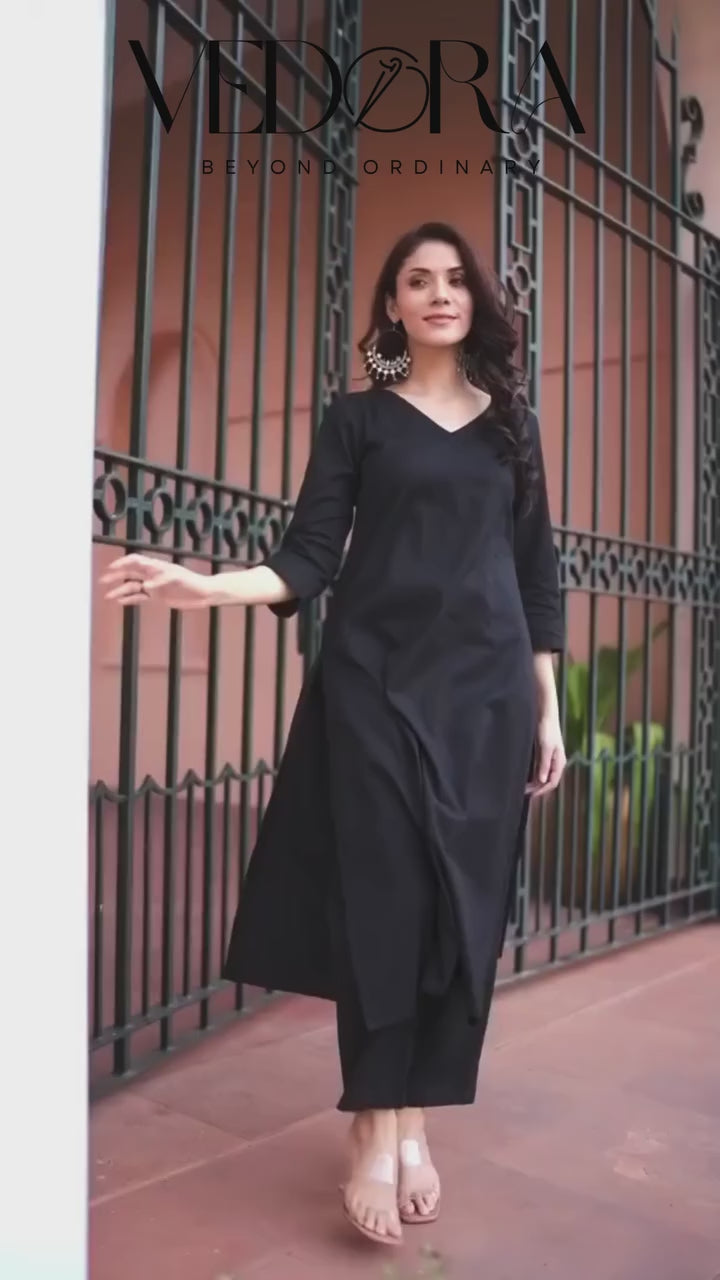 Step into effortless sophistication with Vedora’s "Classic Noir" Black Cotton Kurta Pant Set – a timeless essential that blends traditional grace with a sleek, modern edge. Thoughtfully tailored for the woman who embraces quiet luxury, this all-black ensemble is as versatile as it is elegant.