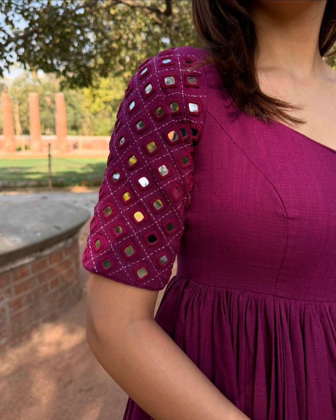 - Embellishment: Hand mirror and bead work on sleeves