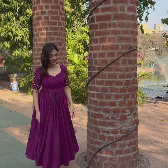 Grace meets grandeur in this deep magenta Anarkali kurta set, crafted for your most cherished occasions. The flared silhouette flatters effortlessly, while intricate mirror and bead work on the sleeves adds just the right hint of shimmer. Made from soft, breathable fabric, this ensemble is your perfect partner for festive days, family gatherings, or elegant evenings.