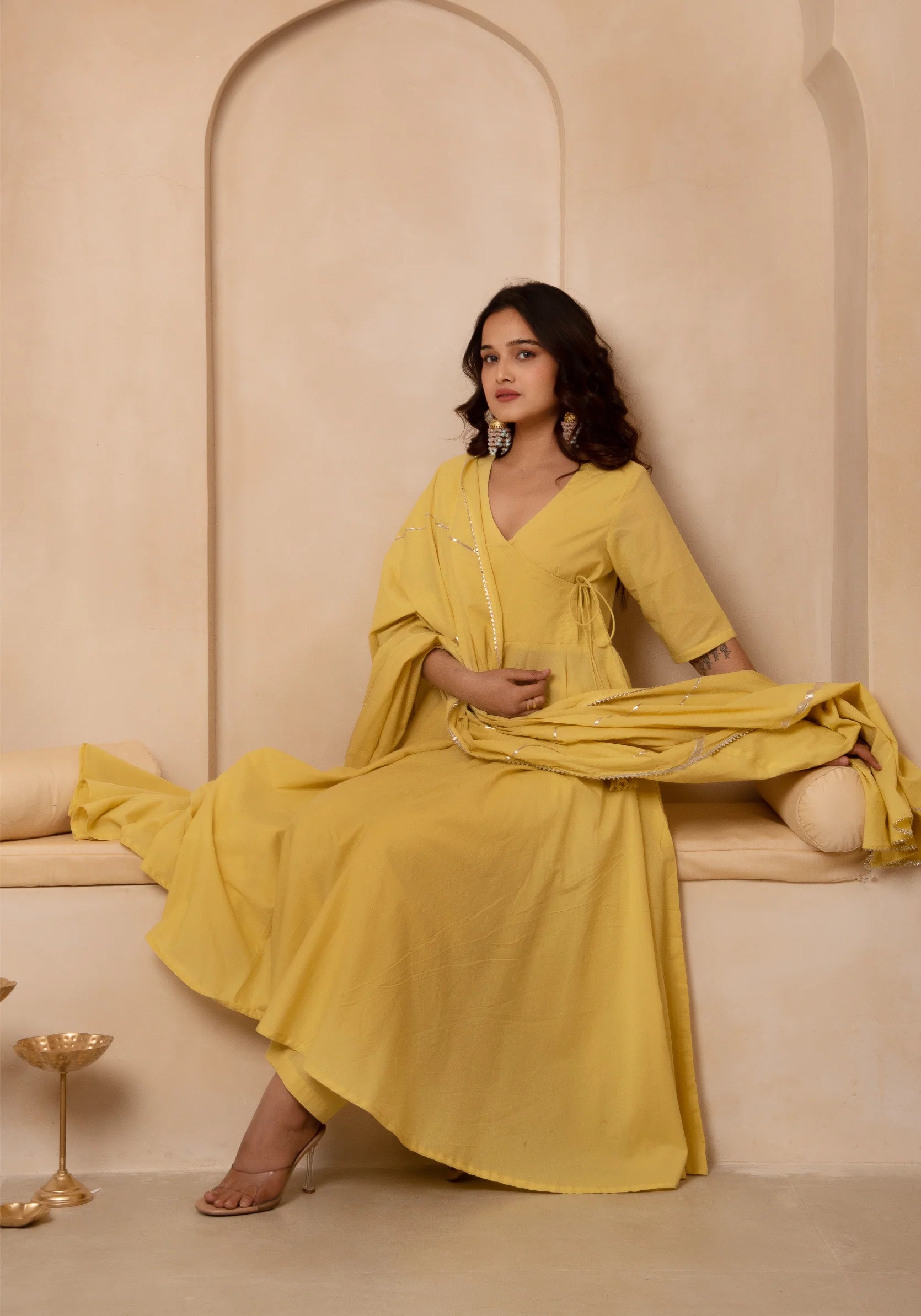 Celebrate the beauty of flow and form with this stunning Angrakha Cotton Suit Set, tailored in a flared silhouette that flatters every move. The timeless angrakha-style tie-up with delicate tassels adds a traditional touch to this otherwise effortlessly modern outfit.