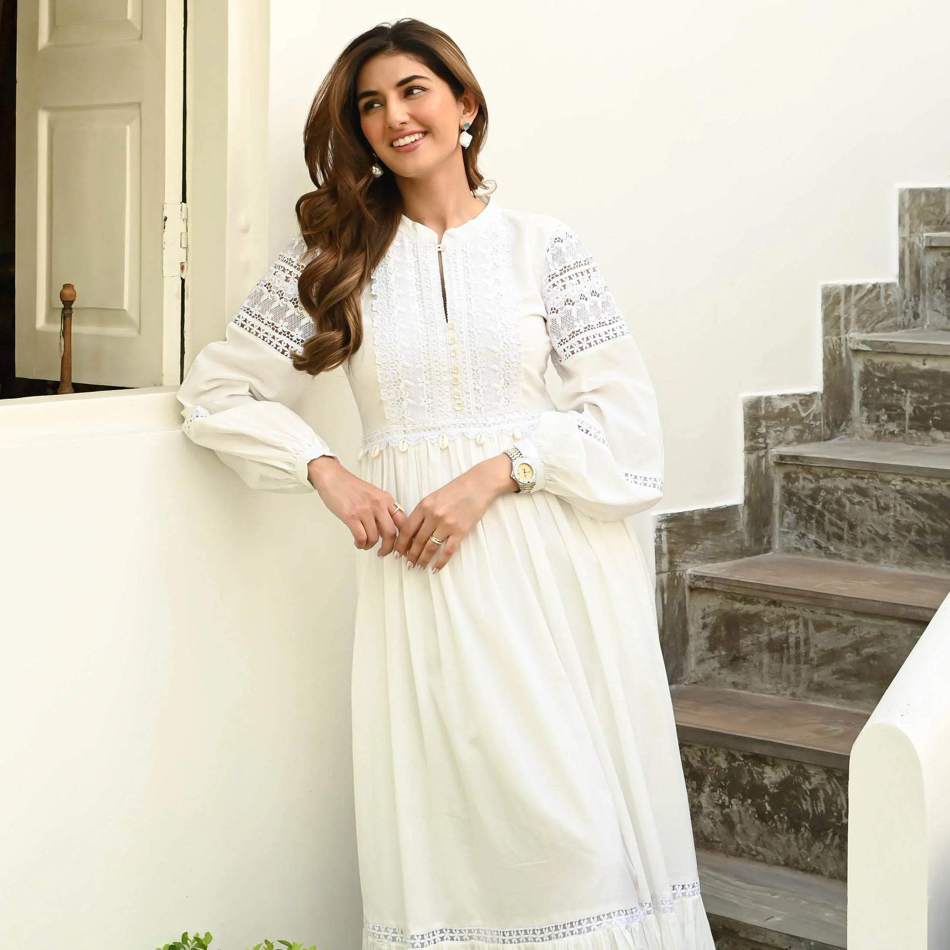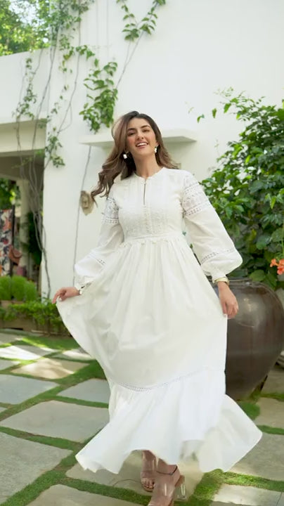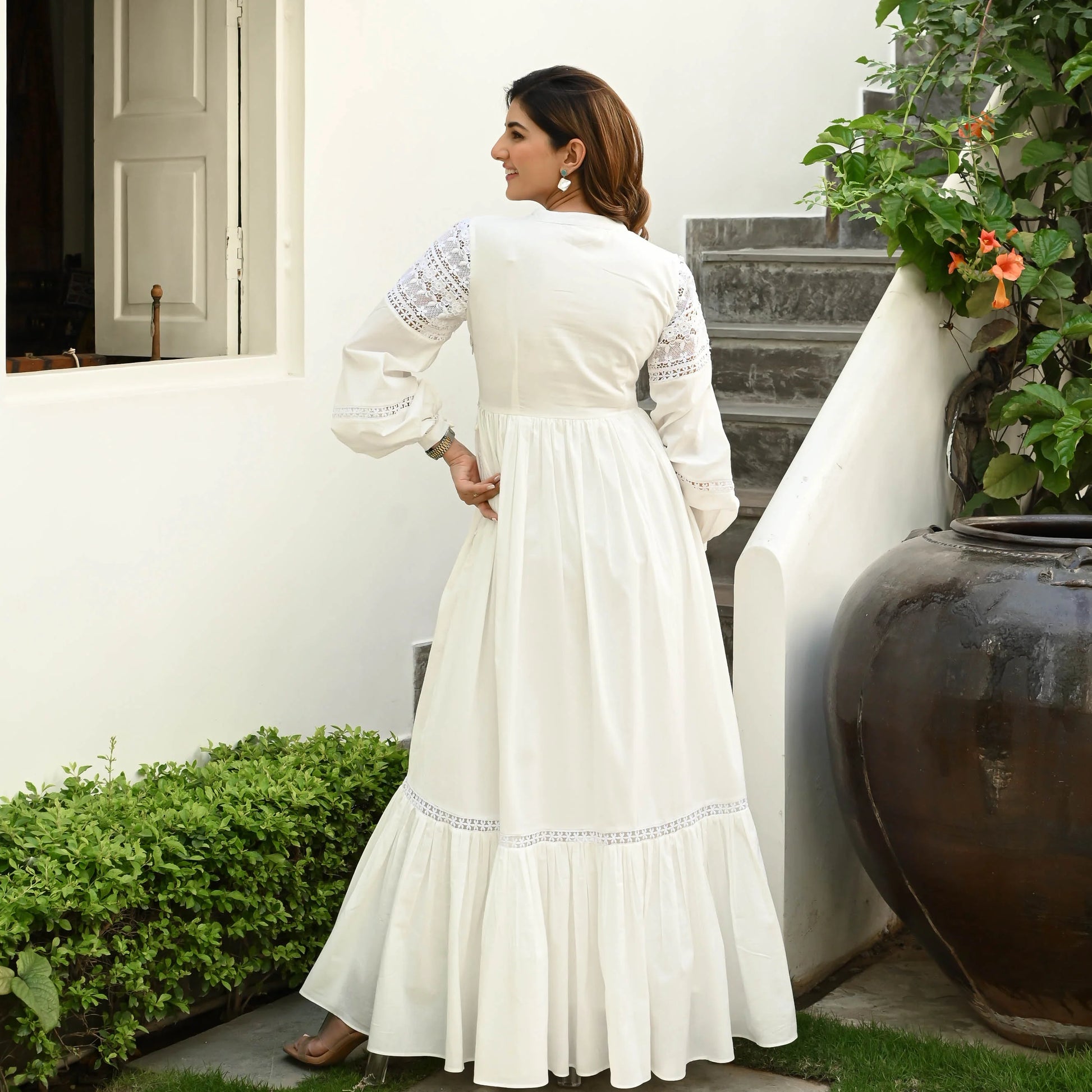 Crafted from soft, breathable cotton, this maxi features a lace-embroidered yoke, intricate lace inserts on the sleeves and hemline, and a flared tiered silhouette for graceful movement. The round neckline with a delicate slit adds a refined finish, making it a versatile choice for both casual gatherings and special occasions.