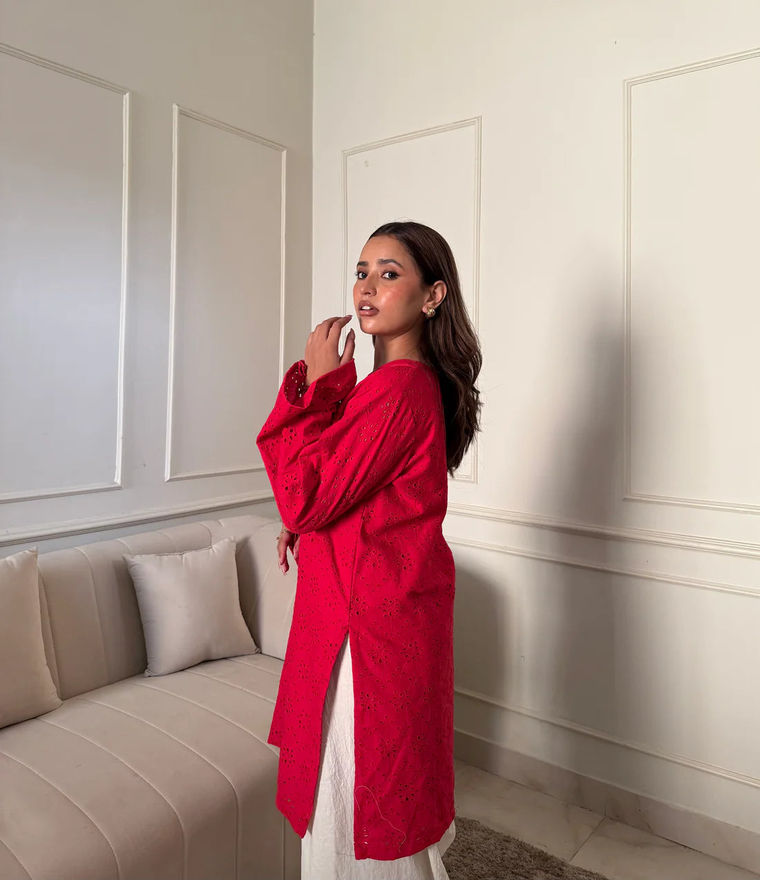 The kurta is a masterpiece of premium Hakoba cotton, featuring intricate, all-over Schiffli eyelet embroidery in a stunning, head-turning shade of vibrant red. It's breathable, comfortable, and undeniably chic.