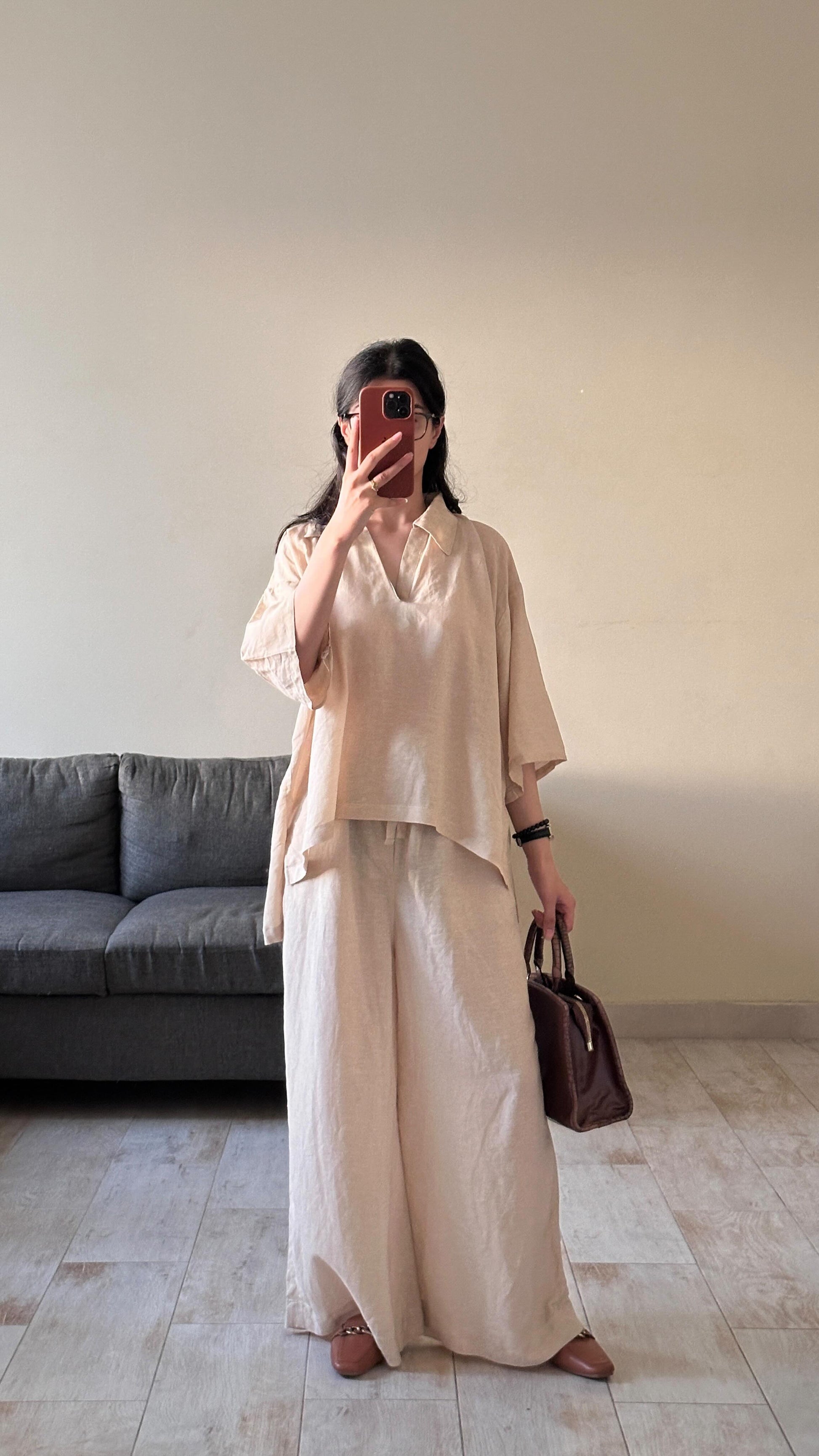 - Top: Boxy half-sleeve shirt with a soft V-neck collar