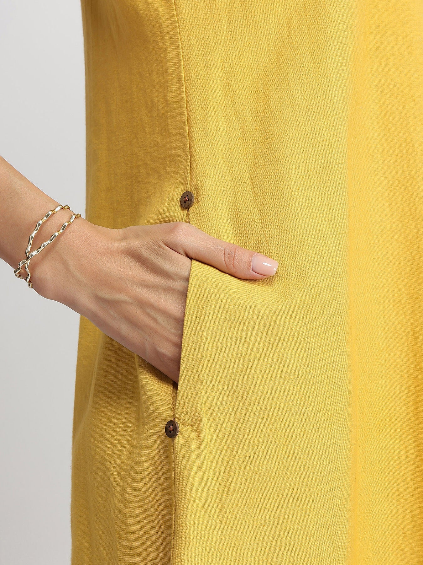 Linen Blend Colourblock A-Line Dress - Yellow & Rust