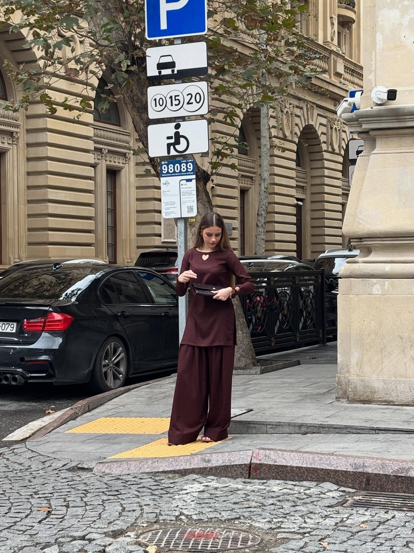 - Accessories: A structured tan tote bag and a classic leather-strap watch.