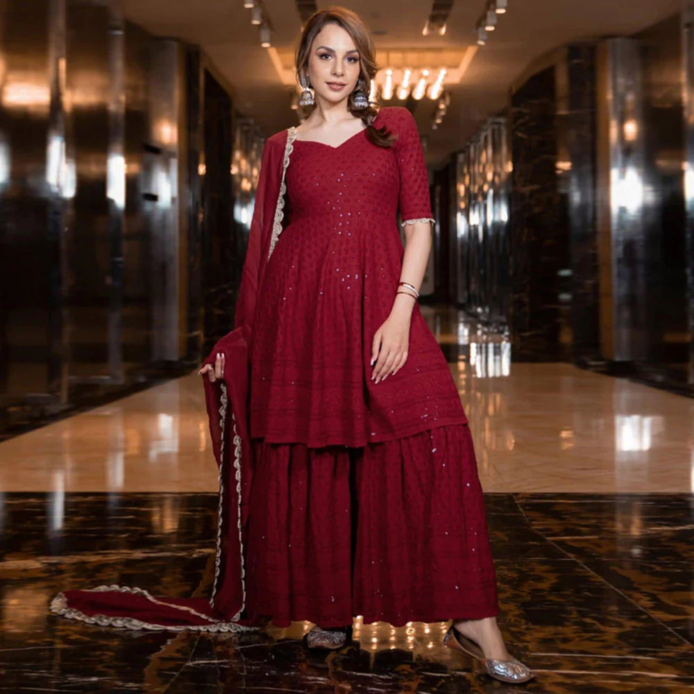 Celebrate every occasion in style with Vedora’s Maroon Sequin Rayon Sharara Suit Set, a statement piece that blends festive shimmer with graceful comfort.