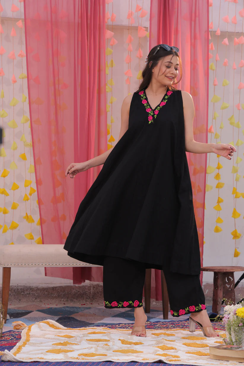 Vedora’s Midnight Rose Cotton Slub Co-ord Set brings together the richness of black with the beauty of handcrafted floral embroidery 🌹