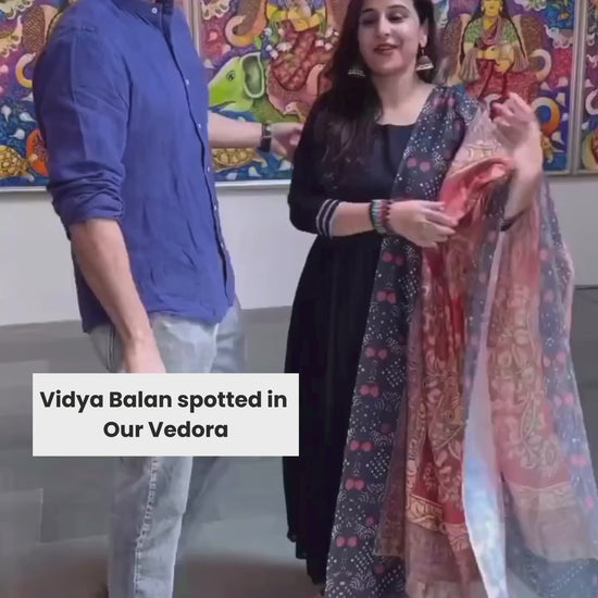 The solid kurta with a graceful flare and three-quarter sleeves exudes understated sophistication, while the handcrafted Kalamkari dupatta showcases intricate peacock and floral motifs, reflecting the artistry of Indian heritage. The matching straight-fit pants ensure effortless movement and all-day comfort.