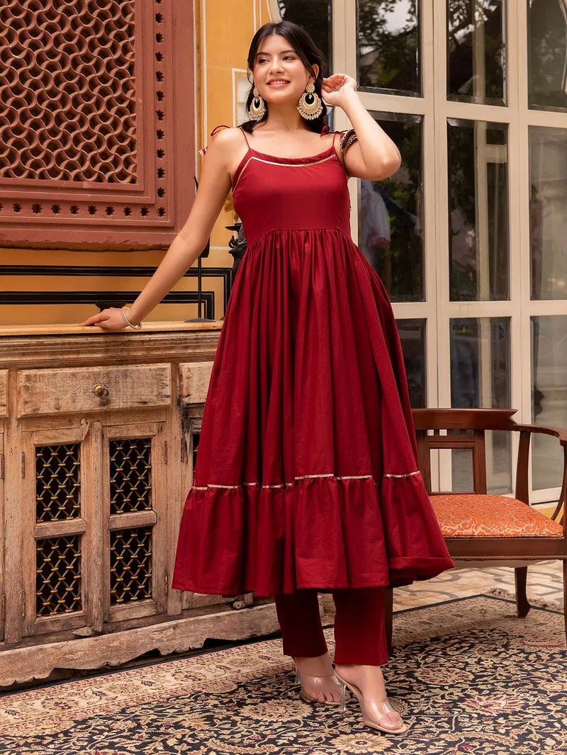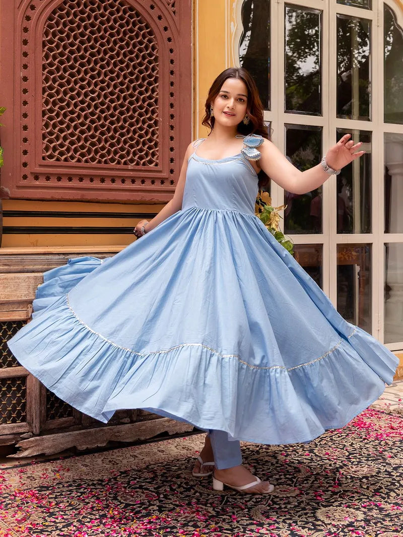 - Sleeveless Anarkali silhouette with elegant tiered layers