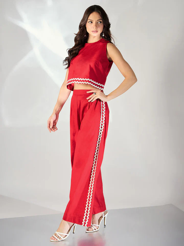 The set features a flattering sleeveless crop top with a clean round neckline and chic trim detail. This is perfectly paired with high-waist, wide-leg pants that flow beautifully and offer maximum comfort. Whether you choose the vibrant Red or another bold solid color, the "Shalini" set is your go-to for destination weddings, festive gatherings, or stylish resort wear. It’s an effortless blend of comfort, bold color, and high-fashion sensibility.