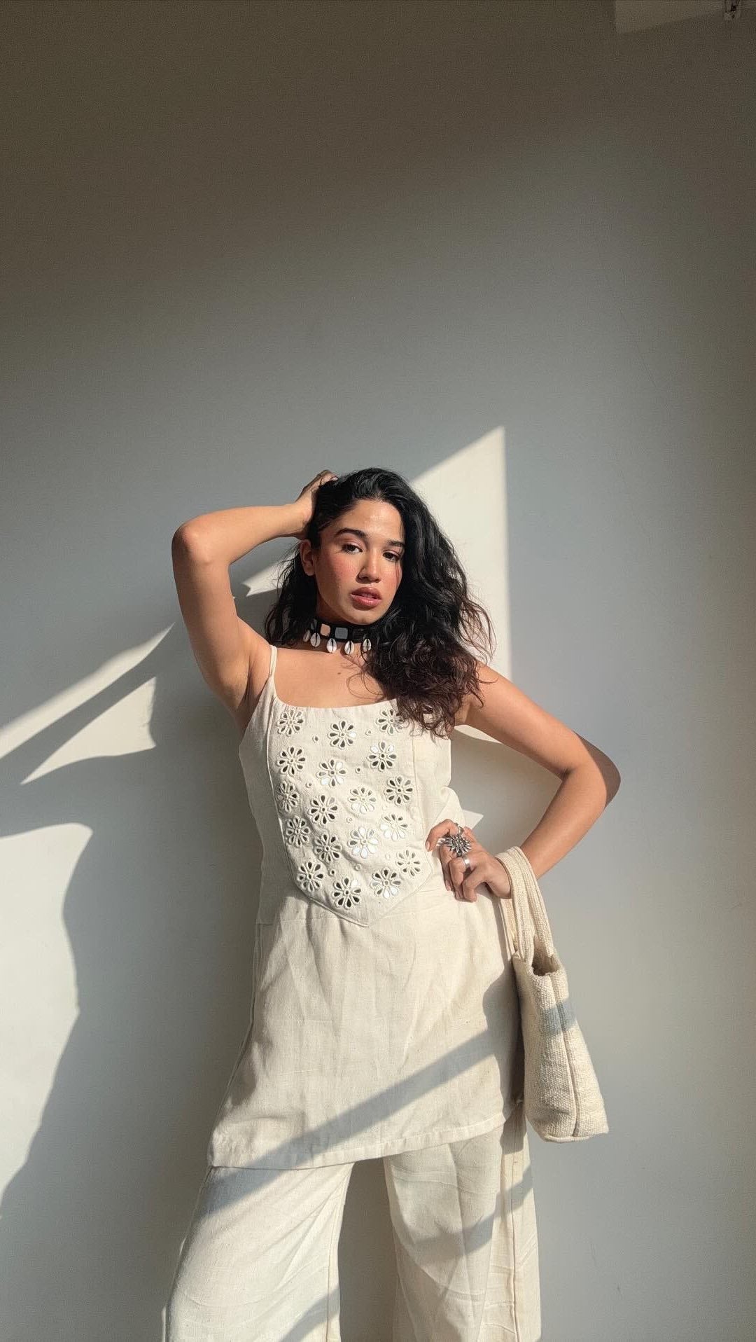 Made from Organic Cotton, this off-white kurta celebrates artisan craftsmanship through its delicate mirror work, bead detailing, and intricate appliqué accents – reminiscent of blooming phool motifs reflecting in sheeshas (mirrors).