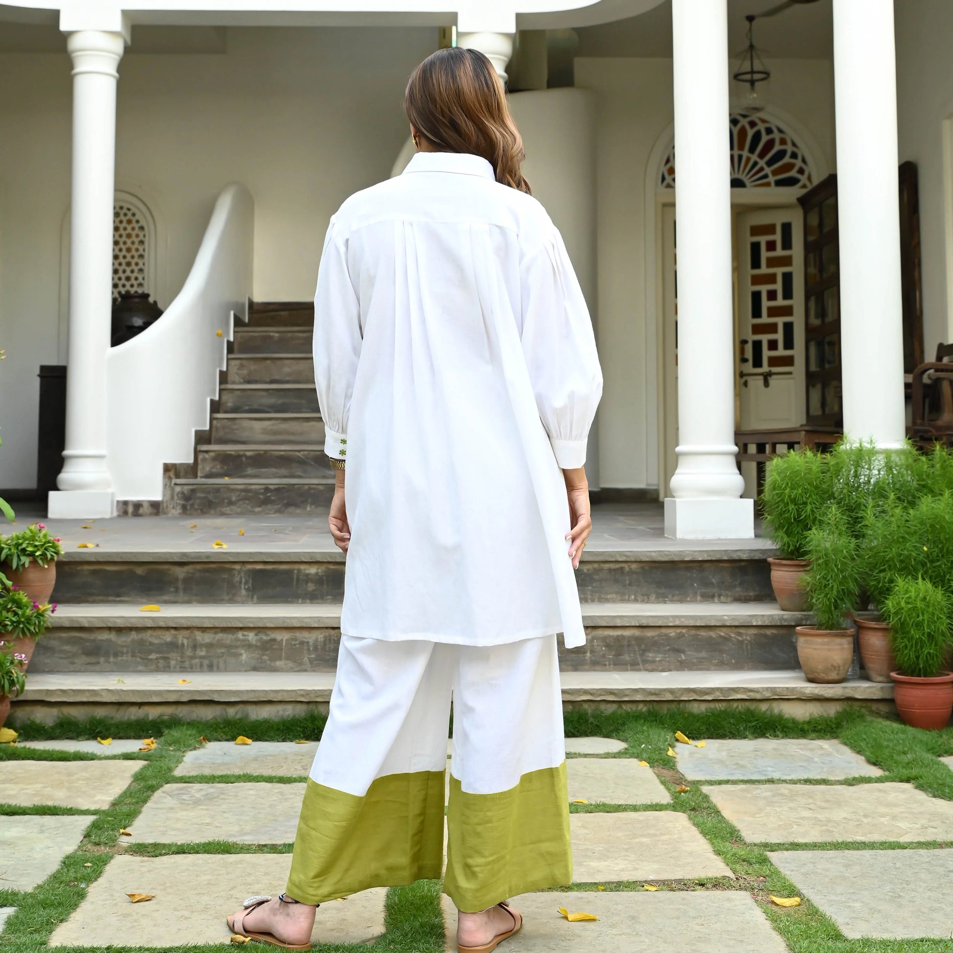 Crafted from 100% premium, crisp cotton, the set offers a clean, relaxed silhouette. The top is a loose, oversized shirt-tunic with a classic collar and subtle contrast green buttons. The sleeves are designed with comfortable volume and cuffed detail.