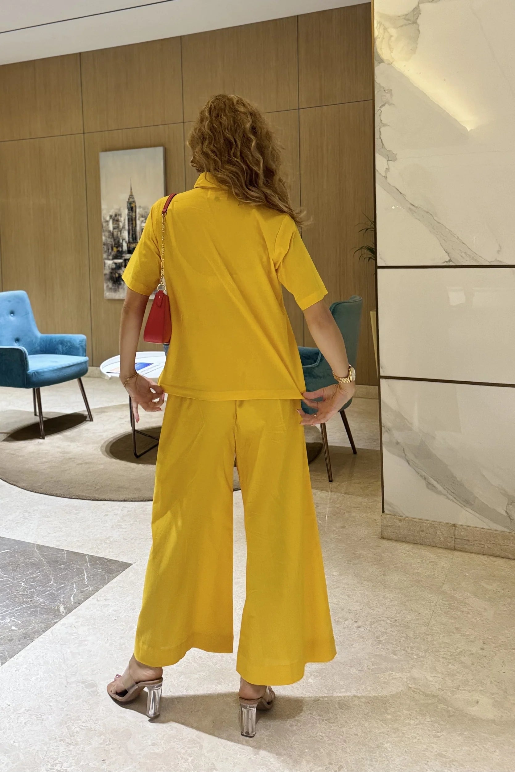 Make comfort your signature style with the Urban Bloom Cotton Co-ord Set, a two-piece outfit that blends timeless tailoring with everyday ease. Designed in premium 100% cotton, this set features a button-down crop top with a crisp collar and short sleeves, paired with wide-leg straight pants that boast a flattering fall, drawstring front, and deep side pockets.
