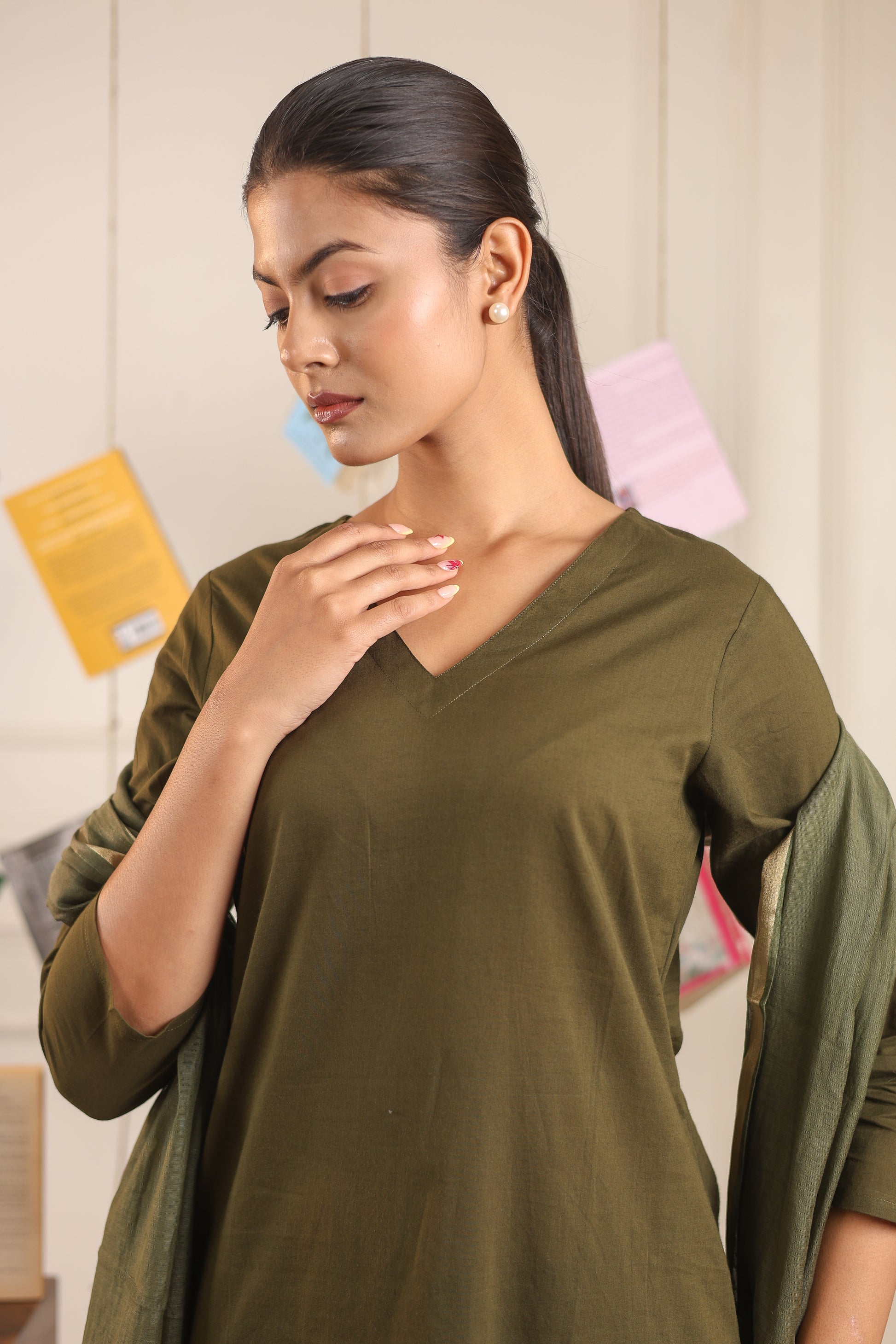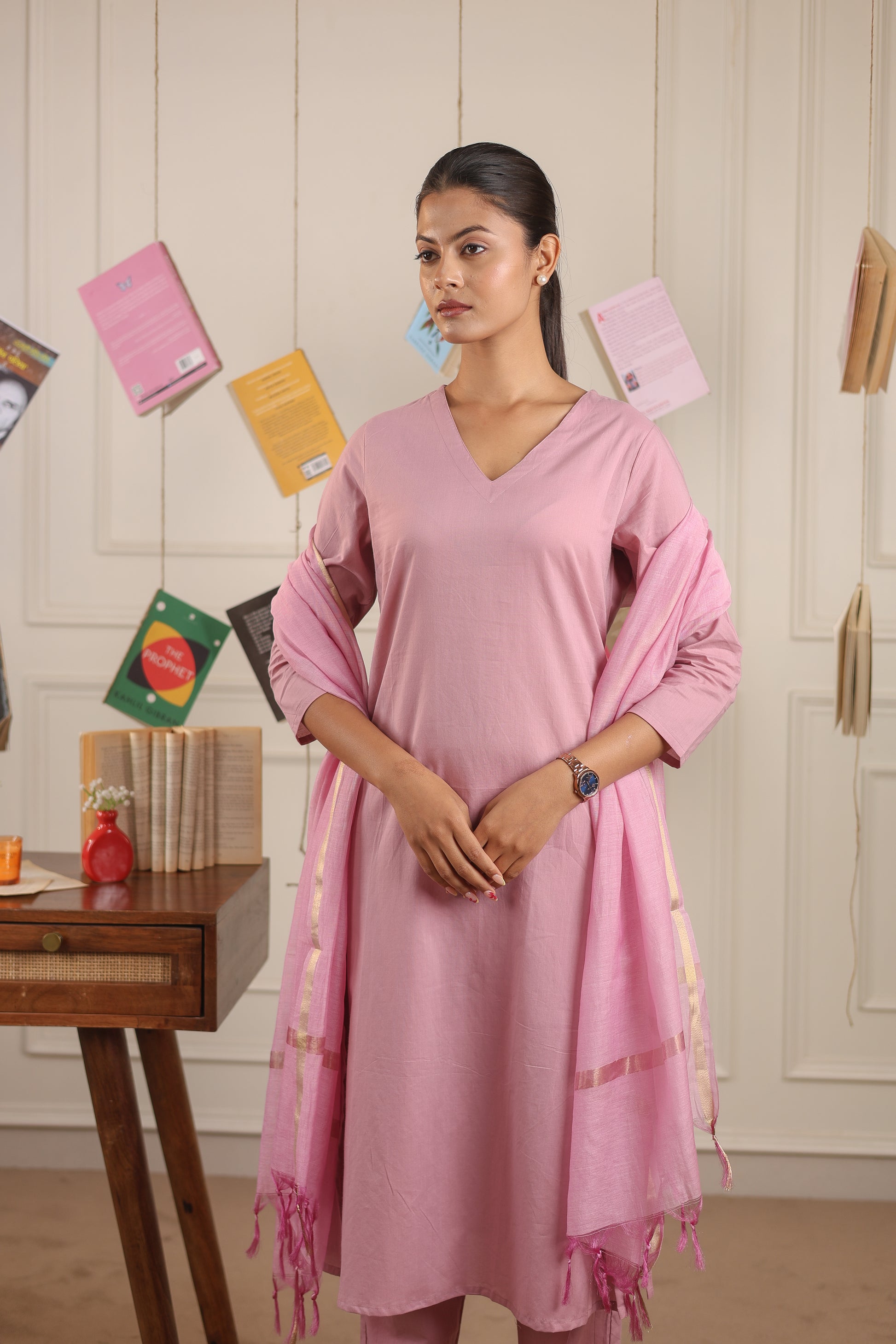 Grace in Every Thread – The Vedora V-Neck Cotton Kurta Set with Chanderi Dupatta